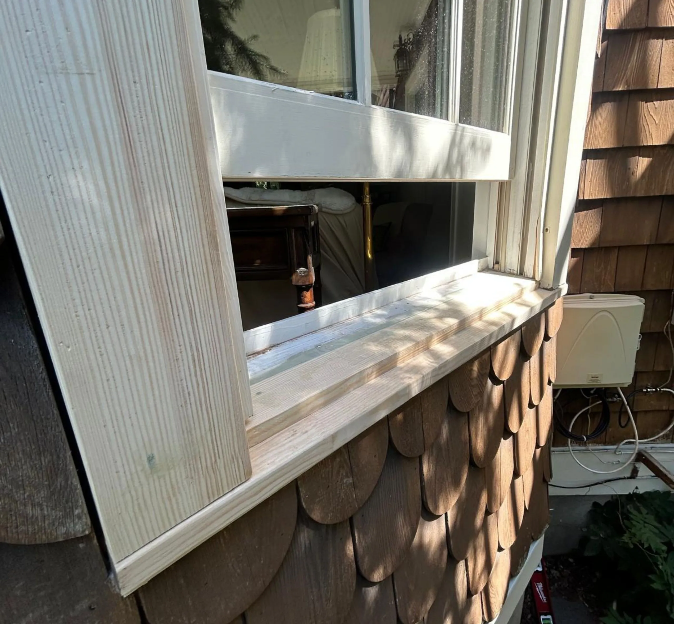 Next came fabrication of the replacement sections. Marvin frames have unique dimensions, so we milled new wood to replicate the exact size and shape of the original sill. The replacement piece was crafted from high-quality lumber, primed to resist moisture, and secured with precision fasteners. Once in place, the frame was seamlessly integrated, ensuring no gaps or weaknesses remained. This careful craftsmanship not only restored the structural integrity but also preserved the authentic look of the Marvin design.