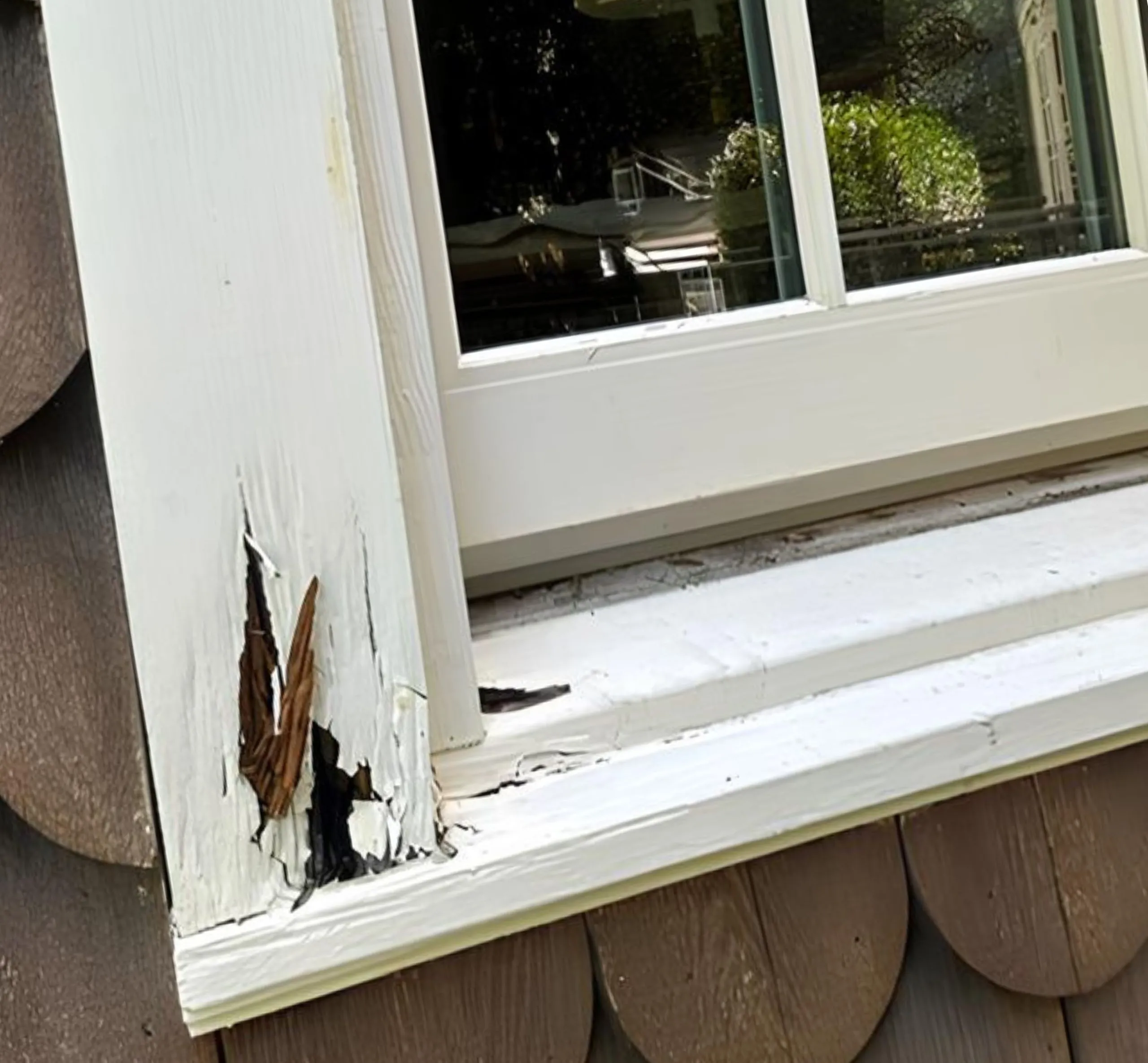 Once the structural work was complete, we moved on to sealing and finishing. We applied advanced wood preservatives to protect against future rot and water damage, then filled, sanded, and smoothed the entire frame. In the “before” image, the decay and peeling paint are easy to see, but in the “after” image, the frame looks as though it had just come from the factory. The rebuilt sill blended seamlessly with the rest of the window, showing the results of expert workmanship.